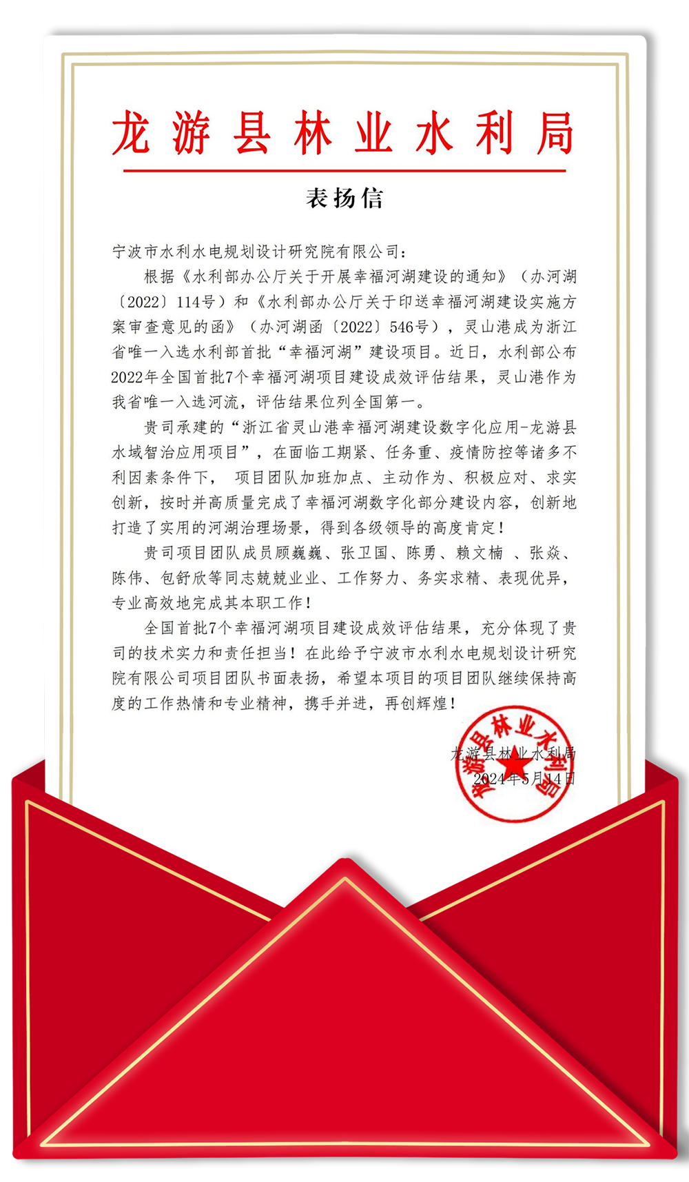 發(fā)布日期:2024.06.05 ? ? ? ?近日,我院收到一封來(lái)自業(yè)主單位衢州市龍游縣林業(yè)水利局的表?yè)P(yáng)信。信中提到:我院在承建“浙江省靈山港幸福河湖建設(shè)數(shù)字化應(yīng)用-龍游縣水域智治應(yīng)用項(xiàng)目”的過(guò)... -