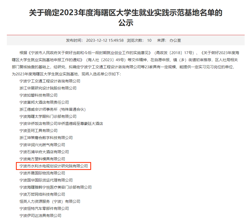發(fā)布日期:2023.12.21 近日,根據(jù)《寧波市人民政府關(guān)于做好當(dāng)前和今后一段時(shí)期就業(yè)創(chuàng)業(yè)工作的實(shí)施意見》(甬政發(fā)〔2018〕17號(hào))、《關(guān)于做好2023年度海曙區(qū)大學(xué)生就業(yè)實(shí)踐基地申報(bào)工作的通知》(海人社〔2023〕... -