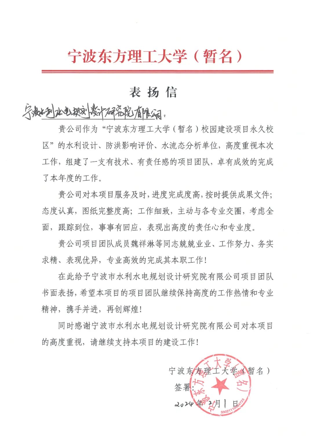 發(fā)布日期:2024.02.07 辭舊迎新之際,寧波市水利院收到寧波東方理工大學(xué)的感謝信。信中提到,我院在寧波東方理工大學(xué)(暫名)校園永久校區(qū)建設(shè)項(xiàng)目中,派出的項(xiàng)目團(tuán)隊(duì)高效、專業(yè)、及時(shí)地做好技術(shù)支撐服務(wù)工... -