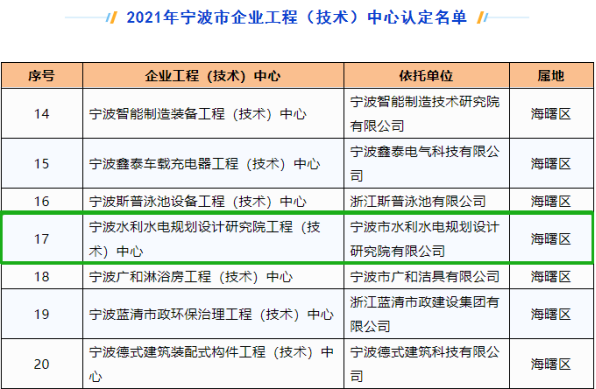 發(fā)布日期:2022.09.15 近日,寧波市發(fā)展和改革委員會、寧波市經(jīng)濟和信息化局、寧波市財政局、寧波市科學技術局聯(lián)合發(fā)文,公布2021年寧波市企業(yè)工程(技術)中心認定名單。我院為主體申報的“寧波水利水電... -