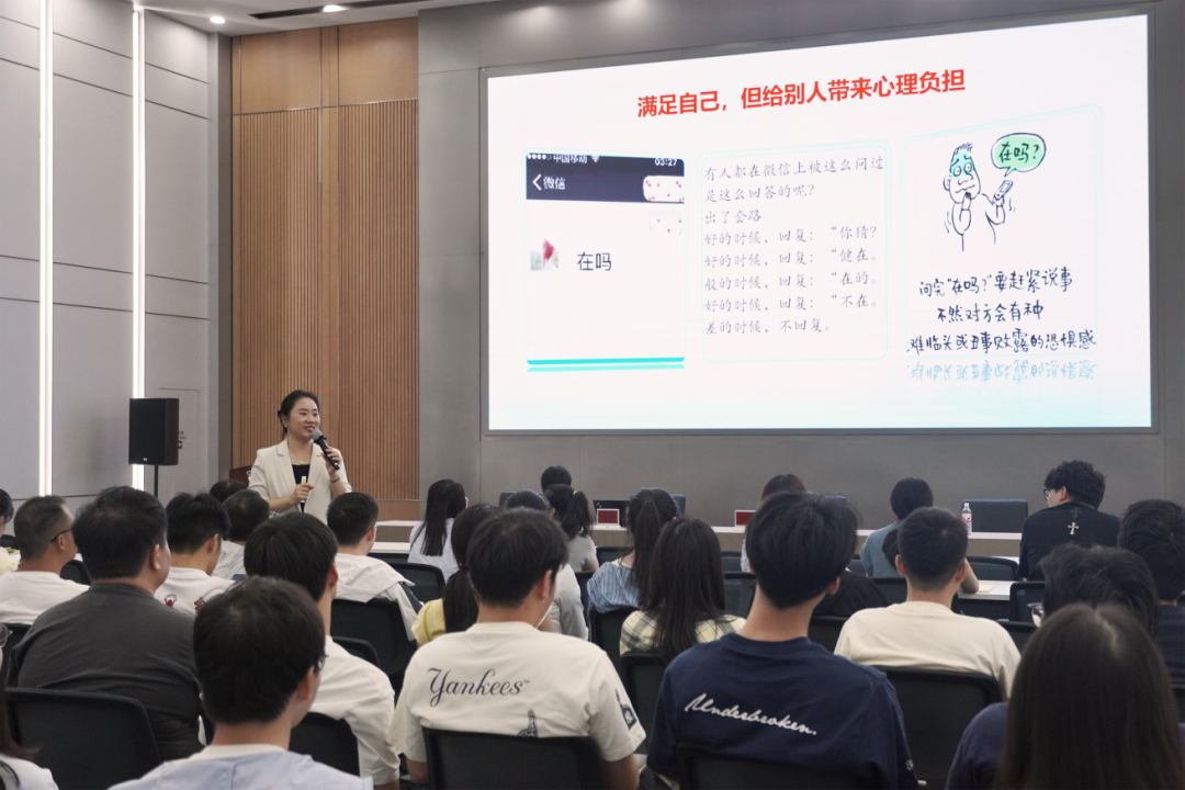 陳瑛老師的講座圍繞自我激勵、協(xié)同溝通、對外溝通、對上溝通四大維度展開。首先,陳瑛老師分別以工作場景和生活場景中的溝通對話與大家進(jìn)行互動,帶領(lǐng)大家對“高情商”進(jìn)行思考與剖析,由此展開當(dāng)天的主題。隨后,結(jié)合豐富的實(shí)戰(zhàn)案例與互動環(huán)節(jié),陳瑛老師層層遞進(jìn),深入淺出地講解了如何在日常工作中實(shí)現(xiàn)高效溝通,激發(fā)自我驅(qū)動力,提升團(tuán)隊協(xié)同效能。在長達(dá)2.5小時的課程中,陳瑛老師還結(jié)合商務(wù)禮儀的要點(diǎn),根據(jù)不同場景對溝通實(shí)操進(jìn)行了解析。并強(qiáng)調(diào),良好的溝通不僅是技巧,更是一種心態(tài)與習(xí)慣的培養(yǎng),也是實(shí)現(xiàn)個人與團(tuán)隊實(shí)現(xiàn)共同成長的重要途徑。