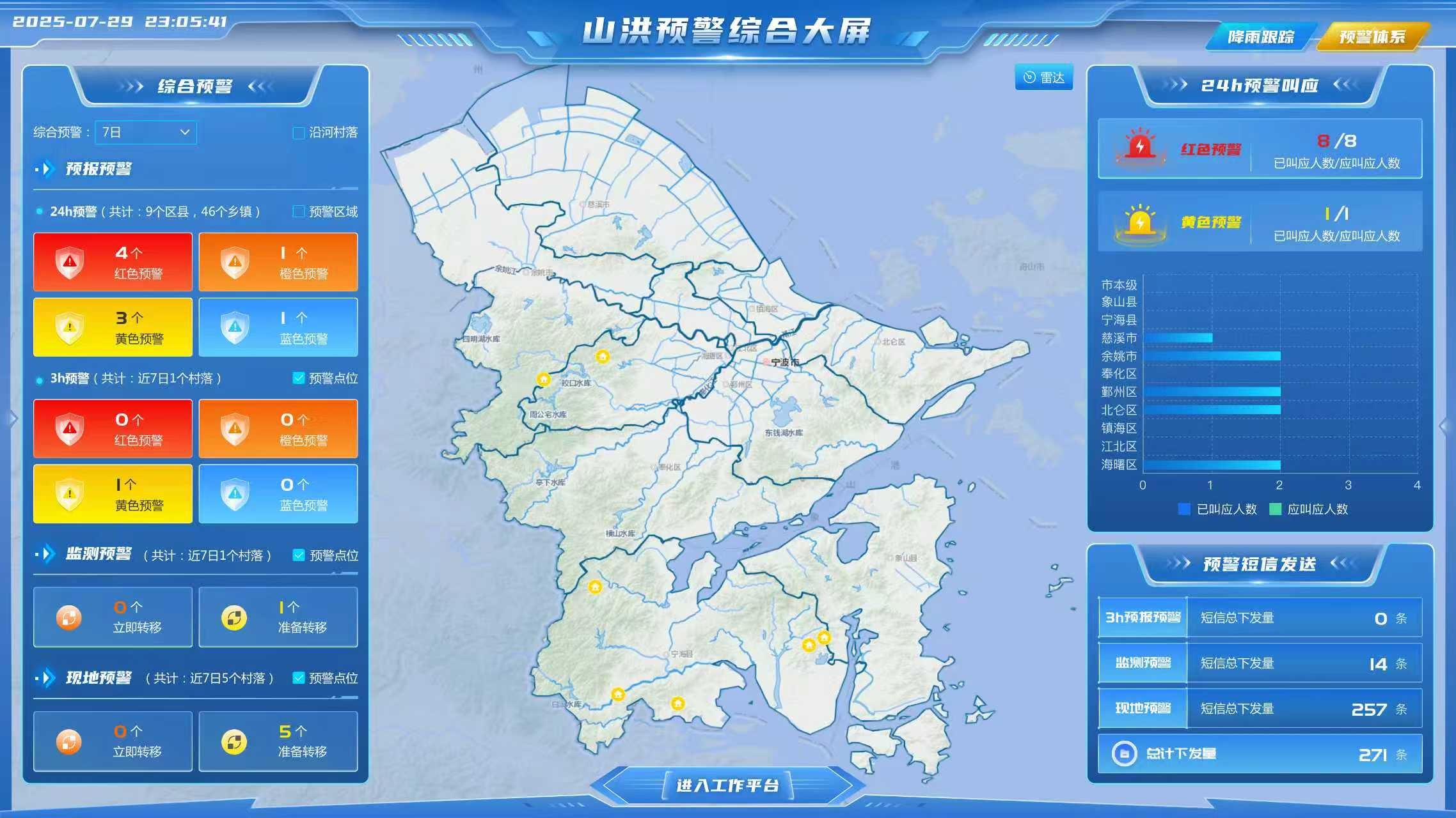 山洪災(zāi)害突發(fā)性強(qiáng)、破壞力大。該平臺(tái)聚焦山洪防御業(yè)務(wù)流程,以氣象部門網(wǎng)格化預(yù)報(bào)降雨為基礎(chǔ),依托精細(xì)化山洪預(yù)報(bào)預(yù)警模型,滾動(dòng)分析全市山洪風(fēng)險(xiǎn)形勢(shì),并及時(shí)向相關(guān)責(zé)任人和社會(huì)公眾發(fā)送提醒短信,實(shí)現(xiàn)快速研判和及時(shí)提醒。