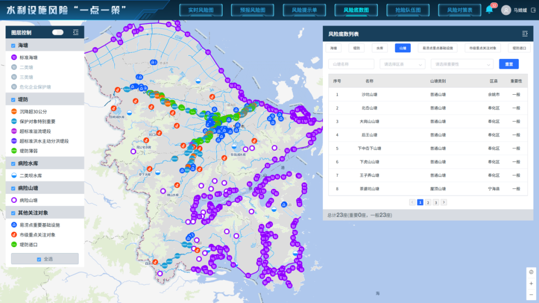 防汛抗洪,首先要摸清風(fēng)險(xiǎn)底數(shù)。每年汛前,該系統(tǒng)定期維護(hù)水庫(kù)、山塘、堤防、海塘等水利設(shè)施及搶險(xiǎn)救援信息,為風(fēng)險(xiǎn)預(yù)報(bào)預(yù)警提供基礎(chǔ)底數(shù)。調(diào)用水利設(shè)施風(fēng)險(xiǎn)研判模型,通過實(shí)時(shí)研判和創(chuàng)建預(yù)報(bào)方案計(jì)算,展示可能產(chǎn)生風(fēng)險(xiǎn)的水利設(shè)施、風(fēng)險(xiǎn)等級(jí)及相應(yīng)對(duì)策措施,形成風(fēng)險(xiǎn)提示單和預(yù)報(bào)風(fēng)險(xiǎn)圖,為搶險(xiǎn)救援提供精準(zhǔn)支撐。