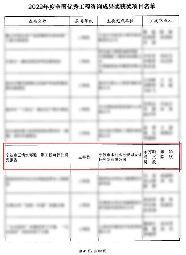 近日,中國工程咨詢協(xié)會(huì)公布2022年度全國優(yōu)秀工程咨詢成果獎(jiǎng)獲獎(jiǎng)項(xiàng)目名單,寧波市水利院申報(bào)的《寧波市區(qū)清水環(huán)通一期工程可行性研究報(bào)告》咨詢成果順利通過公示,榮獲2022年度全國優(yōu)秀工程咨詢成果三等獎(jiǎng)!該獎(jiǎng)項(xiàng)由中國咨詢工程協(xié)會(huì)組織申報(bào)評(píng)審,每兩年評(píng)選一次,是中國工程咨詢行業(yè)含金量最高的獎(jiǎng)項(xiàng)。