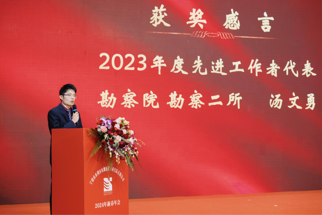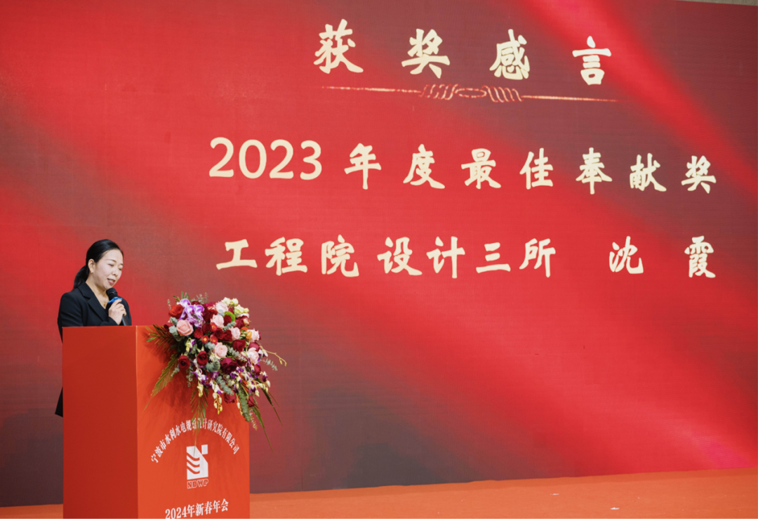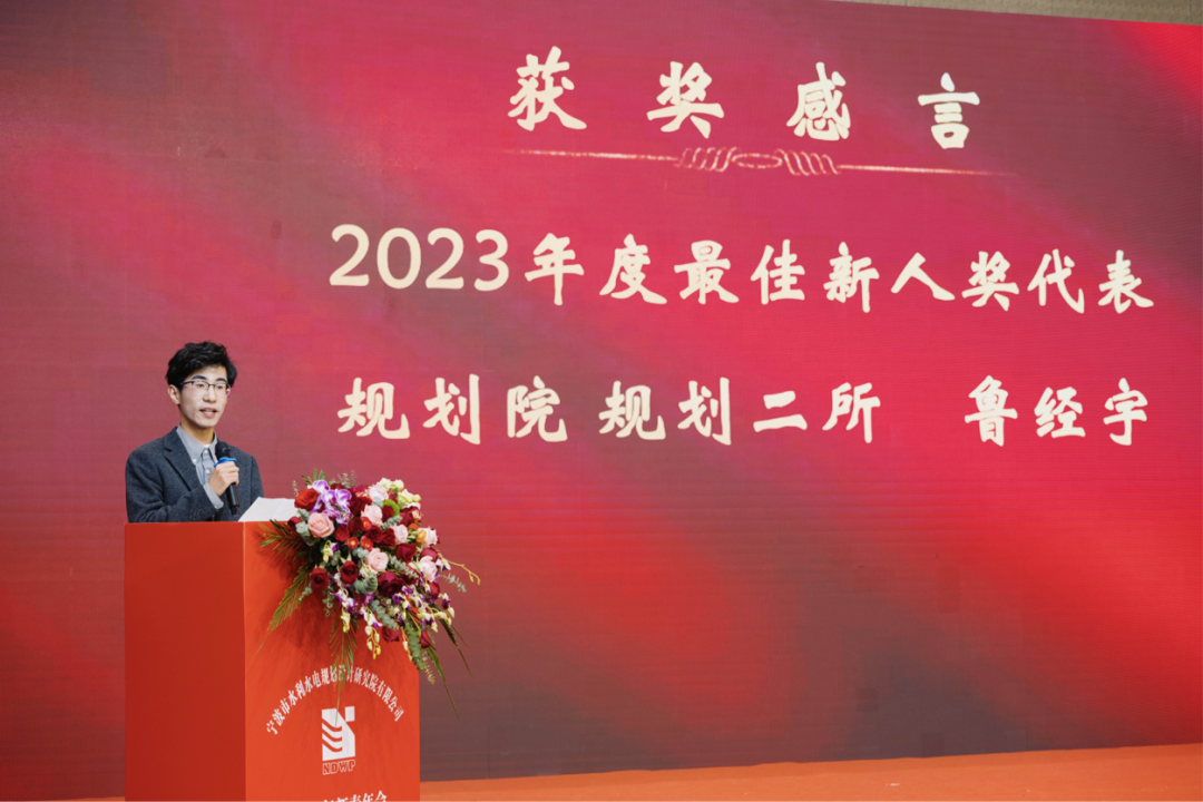 2023年度先進(jìn)工作者獲獎代表勘察院勘察二所的湯文勇、2023年度最佳奉獻(xiàn)獎獲獎?wù)吖こ淘涸O(shè)計三所的沈霞、2023年度最佳新人獎獲獎代表規(guī)劃院規(guī)劃二所的魯經(jīng)宇,先后上臺發(fā)表獲獎感言,以真摯的情感、質(zhì)樸的語言和滿滿的憧憬,表達(dá)了自己與企業(yè)共同成長過程中的勵志故事和切身感悟,表達(dá)了寧波院中堅力量、團隊骨干和新兵后輩的豪情壯志。
